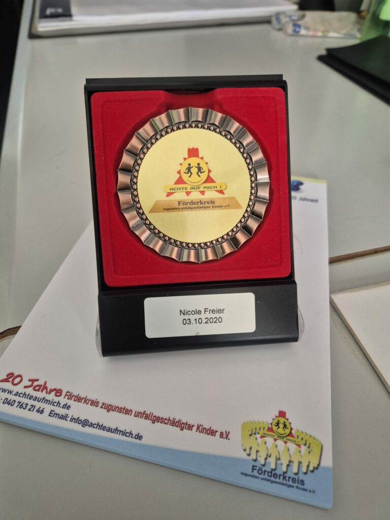 Wir freuen uns sehr, den Förderverein „Achte auf mich“ unter der Schirmherrschaft von Peter Sebastian zu unterstützen. Vor Ostern durften wir ein liebevolles Überraschungspaket des Vereins erhalten: eine wunderschöne Medaille, ein toller Stift und ein praktischer Block – eine kleine Geste, die zeigt, wie herzlich und persönlich der Verein ist.
